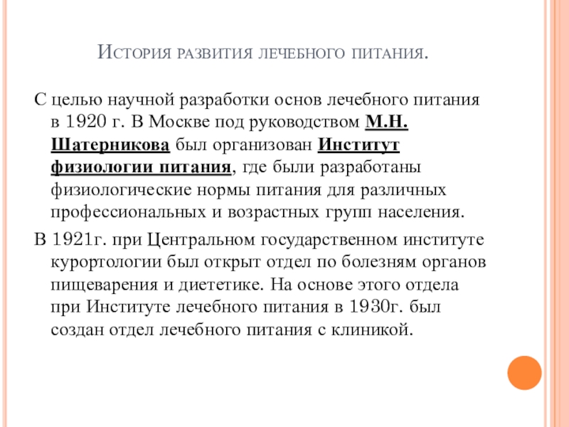 1920 г. В Москве под руководством М.Н.Шатерникова был организован Институт физиологии питания, где были разработаны физиологические нормы питания для различных профессиональных и возрастных групп населения.