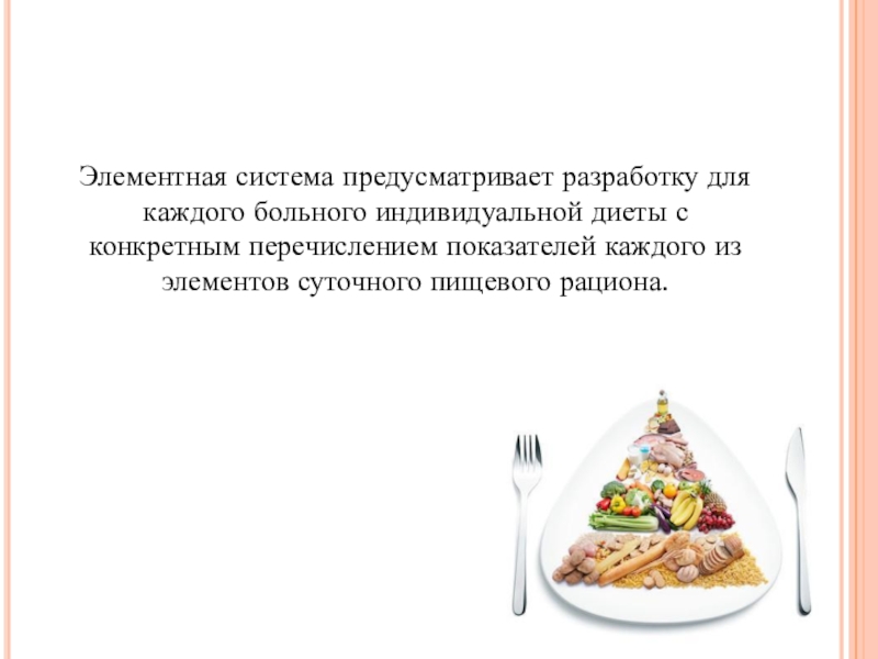 Слайд 30 Элементная система предусматривает разработку для каждого больного индивидуальной диеты