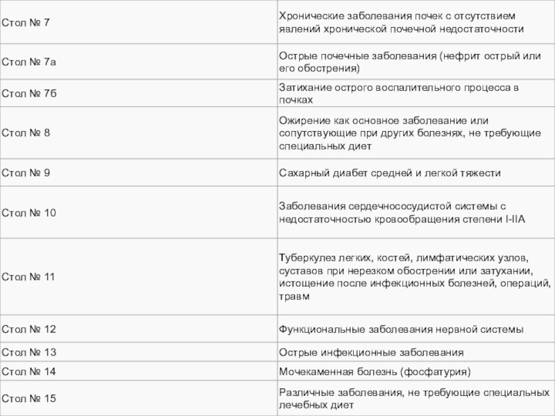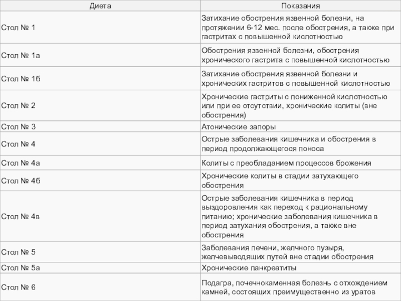 ряда заболеваний. Данная система обеспечивает индивидуальность лечебного питания для людей с различными заболеваниями. Каждая диета называется столом и имеет свой номер. Некоторые диеты имеют несколько вариантов, которые обозначают буквами в номере основной диеты. Особую группу диет составляют нулевые (или хирургические) диеты, а также специальные разгрузочные диеты.