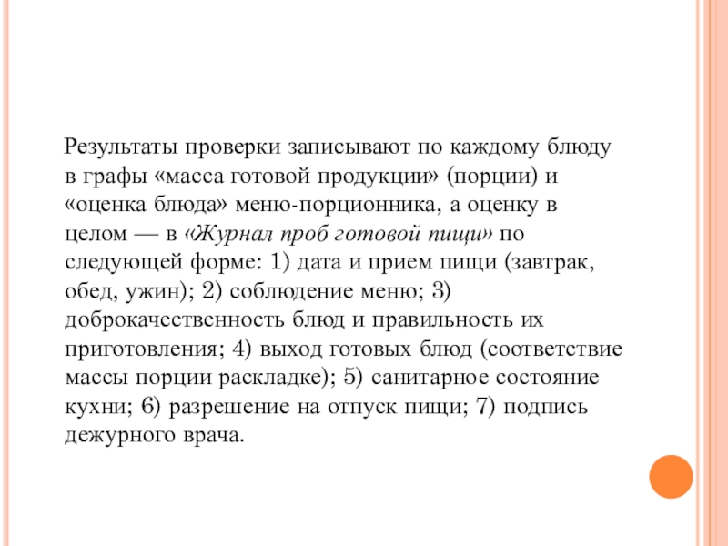 готовой продукции» (порции) и «оценка блюда» меню-порционника, а оценку в целом — в «Журнал проб готовой пищи» по следующей форме: 1) дата и прием пищи (завтрак, обед, ужин); 2) соблюдение меню; 3) доброкачественность блюд и правильность их приготовления; 4) выход готовых блюд (соответствие массы порции раскладке); 5) санитарное состояние кухни; 6) разрешение на отпуск пищи; 7) подпись дежурного врача.