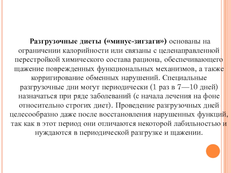 с целенаправленной перестройкой химического состава рациона, обеспечивающего щажение поврежденных функциональных механизмов, а также корригирование обменных нарушений. Специальные разгрузочные дни могут периодически (1 раз в 7—10 дней) назначаться при ряде заболеваний (с начала лечения на фоне относительно строгих диет). Проведение разгрузочных дней целесообразно даже после восстановления нарушенных функций, так как в этот период они отличаются некоторой лабильностью и нуждаются в периодической разгрузке и щажении.