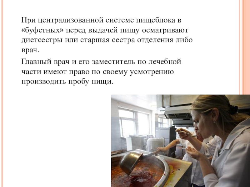 Слайд 48 Пищу из кухни в отделения при централизованной системе пищеблока получает буфетчица