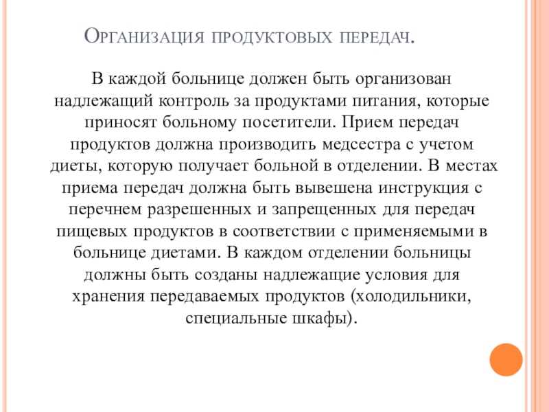 контроль за продуктами питания, которые приносят больному посетители. Прием передач продуктов должна производить медсестра с учетом диеты, которую получает больной в отделении. В местах приема передач должна быть вывешена инструкция с перечнем разрешенных и запрещенных для передач пищевых продуктов в соответствии с применяемыми в больнице диетами. В каждом отделении больницы должны быть созданы надлежащие условия для хранения передаваемых продуктов (холодильники, специальные шкафы).