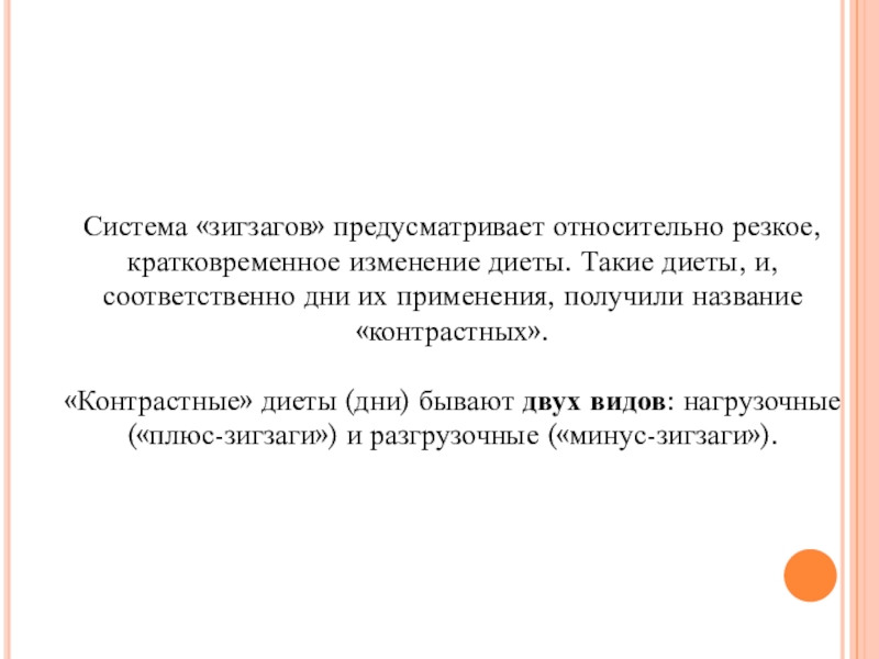 Слайд 55 Система «зигзагов» предусматривает относительно резкое, кратковременное изменение диеты. Такие