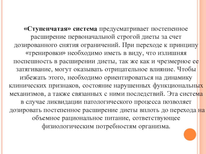 счет дозированного снятия ограничений. При переходе к принципу «тренировки» необходимо иметь в виду, что излишняя поспешность в расширении диеты, так же как и чрезмерное ее затягивание, могут оказывать отрицательное влияние. Чтобы избежать этого, необходимо ориентироваться на динамику клинических признаков, состояние нарушенных функциональных механизмов, а также связанных с ними последствий. Эта система в случае ликвидации патологического процесса позволяет дозировать постепенное расширение диеты вплоть до перехода на объемное рациональное питание, сответствующее физиологическим потребностям организма.