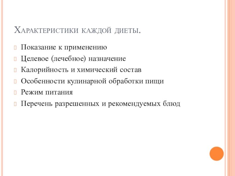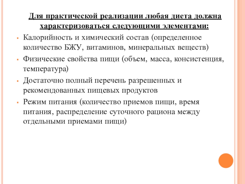 Слайд 22 Для практической реализации любая диета должна характеризоваться следующими элементами:
