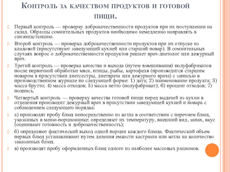 Второй контроль — проверка доброкачественности продуктов при их отпуске из кладовой (присутствуют заведующий кухней или старший повар). В сомнительных случаях вопрос о доброкачественности продуктов решает врач-диетолог или дежурный врач.