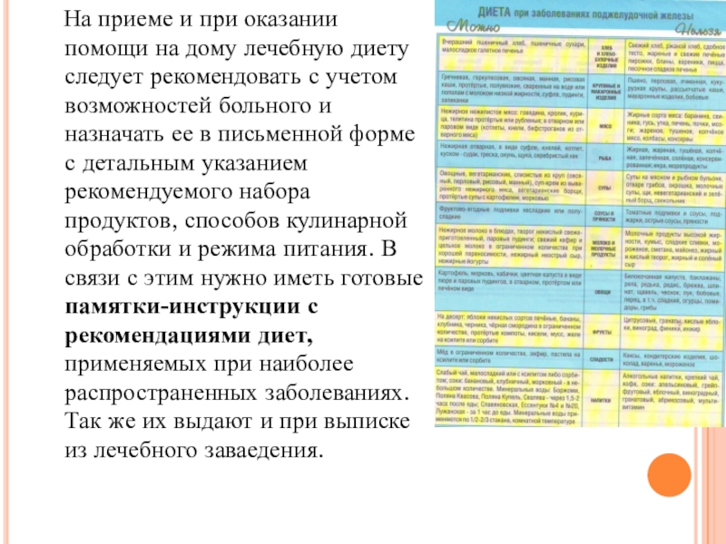 лечебную диету следует рекомендовать с учетом возможностей больного и назначать ее в письменной форме с детальным указанием рекомендуемого набора продуктов, способов кулинарной обработки и режима питания. В связи с этим нужно иметь готовые памятки-инструкции с рекомендациями диет, применяемых при наиболее распространенных заболеваниях. Так же их выдают и при выписке из лечебного заваедения.
