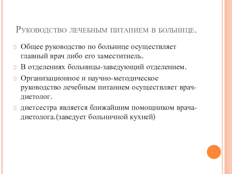 Организационное и научно-методическое руководство лечебным питанием осуществляет врач-диетолог.