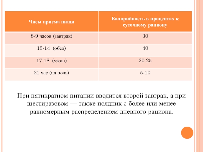 Слайд 26При пятикратном питании вводится второй завтрак, а при шестиразовом — также