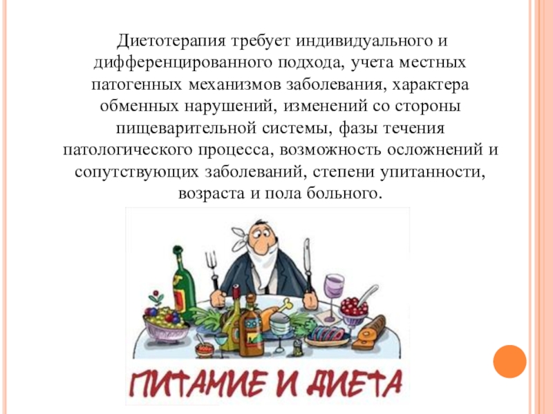 механизмов заболевания, характера обменных нарушений, изменений со стороны пищеварительной системы, фазы течения патологического процесса, возможность осложнений и сопутствующих заболеваний, степени упитанности, возраста и пола больного.