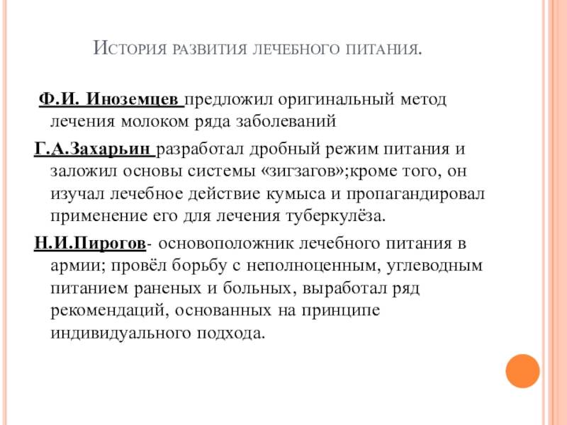 Н.И.Пирогов- основоположник лечебного питания в армии; провёл борьбу с неполноценным, углеводным питанием раненых и больных, выработал ряд рекомендаций, основанных на принципе индивидуального подхода.