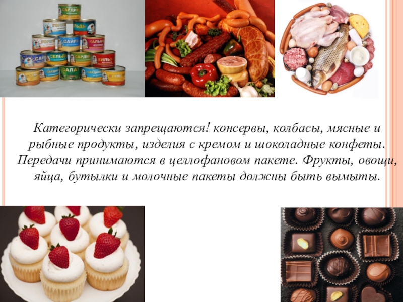 с кремом и шоколадные конфеты. Передачи принимаются в целлофановом пакете. Фрукты, овощи, яйца, бутылки и молочные пакеты должны быть вымыты.