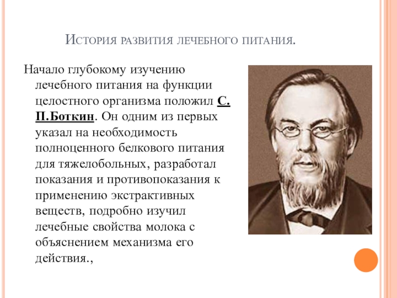 организма положил С.П.Боткин. Он одним из первых указал на необходимость полноценного белкового питания для тяжелобольных, разработал показания и противопоказания к применению экстрактивных веществ, подробно изучил лечебные свойства молока с объяснением механизма его действия.,