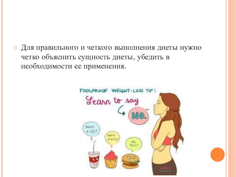 Слайд 37Для правильного и четкого выполнения диеты нужно четко объяснить сущность диеты,