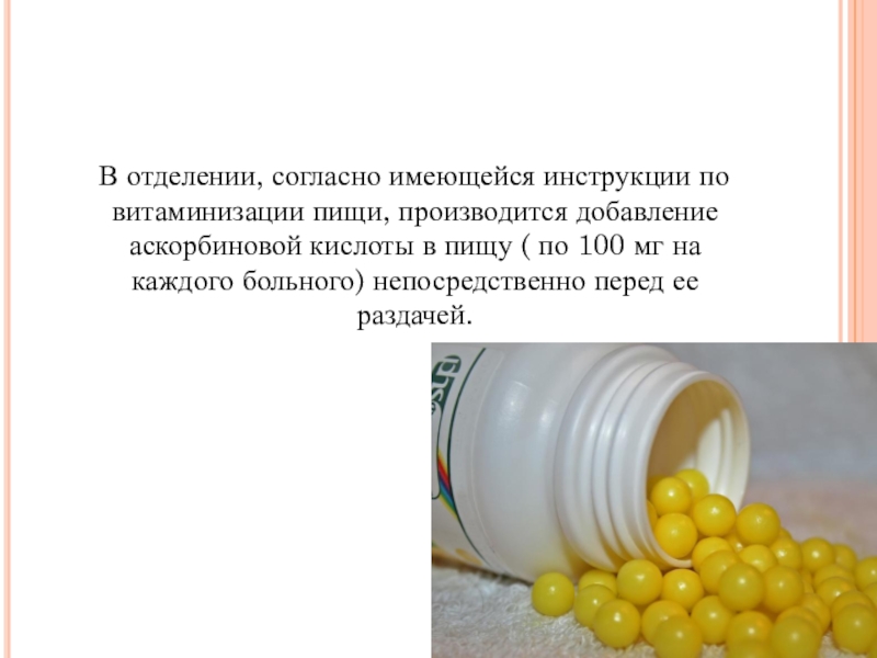 Слайд 50 В отделении, согласно имеющейся инструкции по витаминизации пищи, производится