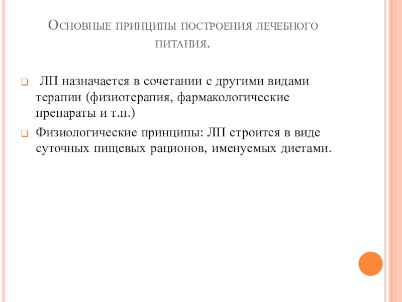 Физиологические принципы: ЛП строится в виде суточных пищевых рационов, именуемых диетами.