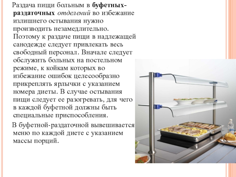 Слайд 49 Раздача пищи больным в буфетных-раздаточных отделений во избежание излишнего остывания нужно
