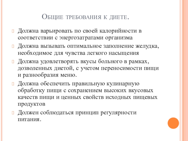 Должна удовлетворять вкусы больного в рамках, дозволенных диетой, с учетом переносимости пищи и разнообразия меню.