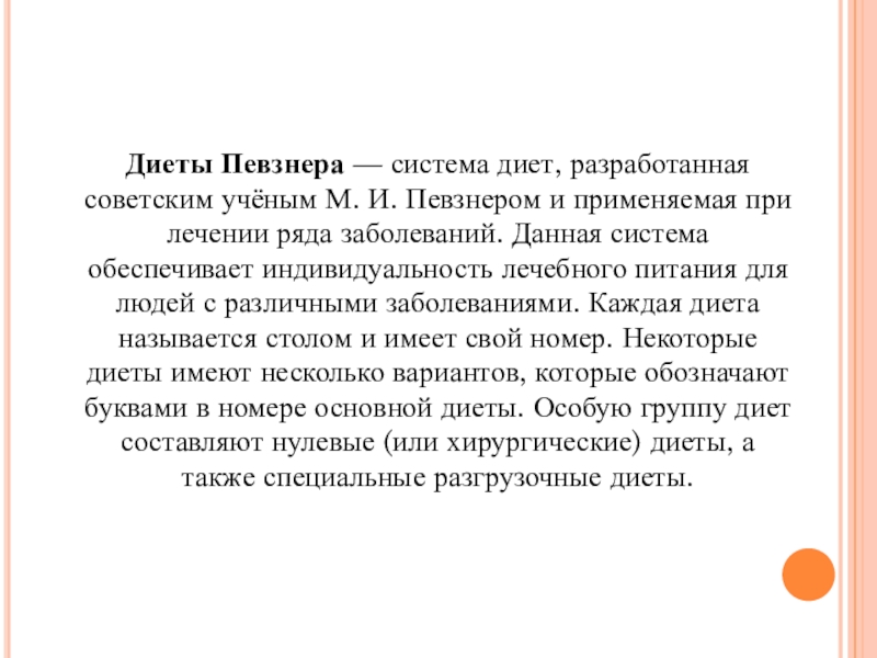 Слайд 58 Диеты Певзнера — система диет, разработанная советским учёным М. И. Певзнером и применяемая при лечении