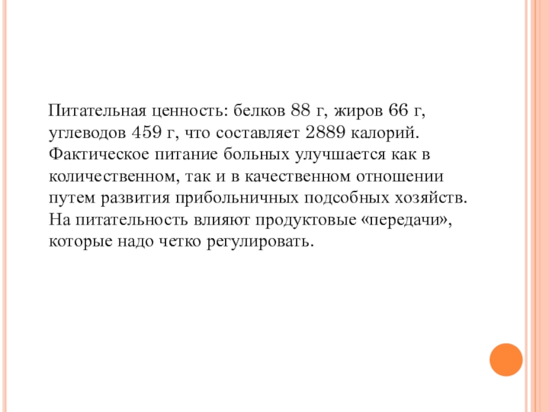 459 г, что составляет 2889 калорий. Фактическое питание больных улучшается как в количественном, так и в качественном отношении путем развития прибольничных подсобных хозяйств. На питательность влияют продуктовые «передачи», которые надо четко регулировать.