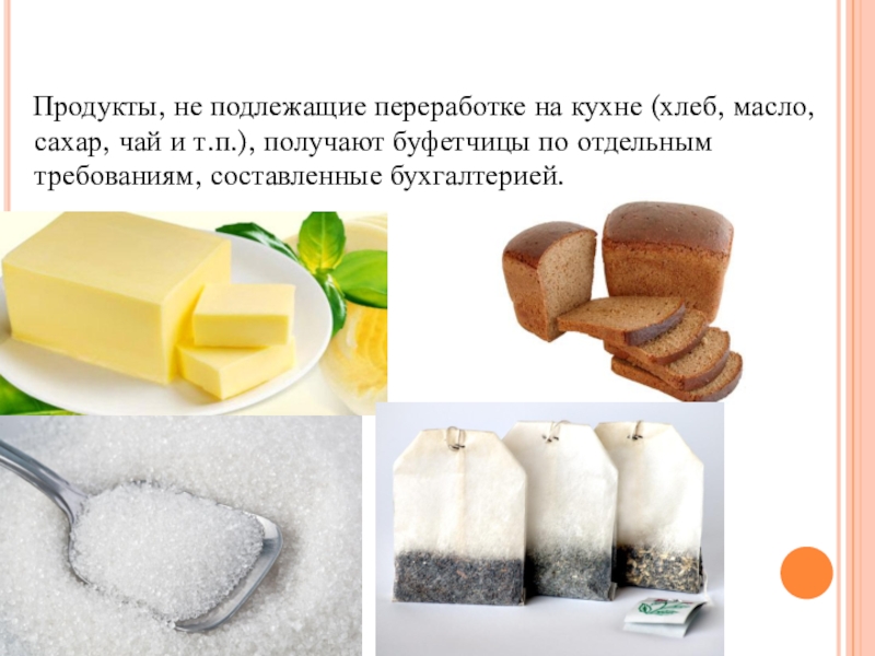масло, сахар, чай и т.п.), получают буфетчицы по отдельным требованиям, составленные бухгалтерией.