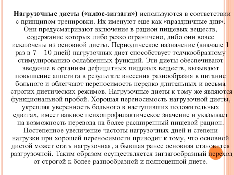 тренировки. Их именуют еще как «праздничные дни». Они предусматривают включение в рацион пищевых веществ, содержание которых либо резко ограничено, либо они вовсе исключены из основной диеты. Периодическое назначение (вначале 1 раз в 7—10 дней) нагрузочных диет способствует толчкообразному стимулированию ослабленных функций. Эти диеты обеспечивают введение в организм дефицитных пищевых веществ, вызывают повышение аппетита в результате внесения разнообразия в питание больного и облегчают переносимость нередко длительных и весьма строгих диетических режимов. Нагрузочные диеты к тому же являются функциональной пробой. Хорошая переносимость нагрузочной диеты, укрепляя уверенность больного в наступивших положительных сдвигах, имеет важное психопрофилактическое значение и указывает на возможность перевода на более расширенный пищевой рацион. Постепенное увеличение частоты нагрузочных дней и степени нагрузки при хорошей переносимости приводит к тому, что основной диетой может стать нагрузочная, а бывшая ранее основная становится разгрузочной. Таким образом осуществляется зигзагообразный переход от строгой к более разнообразной и полноценной диете.