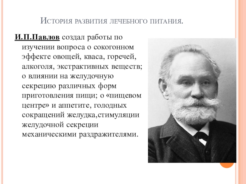 эффекте овощей, кваса, горечей, алкоголя, экстрактивных веществ; о влиянии на желудочную секрецию различных форм приготовления пищи; о «пищевом центре» и аппетите, голодных сокращений желудка,стимуляции желудочной секреции механическими раздражителями.