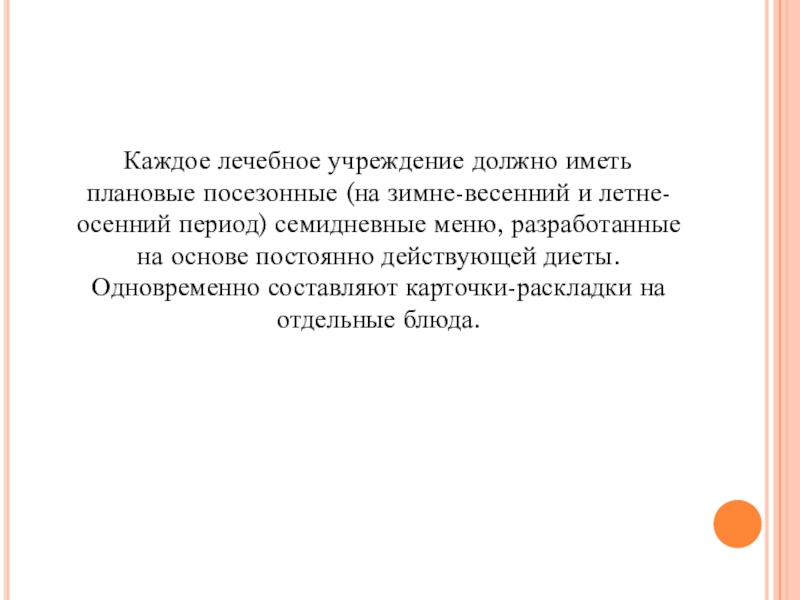 и летне-осенний период) семидневные меню, разработанные на основе постоянно действующей диеты. Одновременно составляют карточки-раскладки на отдельные блюда.