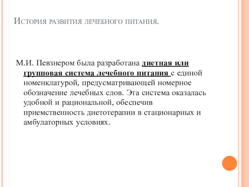 лечебного питания с единой номенклатурой, предусматривающей номерное обозначение лечебных слов. Эта система оказалась удобной и рациональной, обеспечив приемственность диетотерапии в стационарных и амбулаторных условиях.