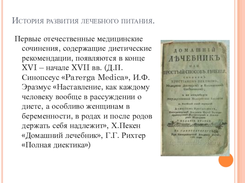 в конце XVI – начале XVII вв. (Д.П.Синопсеус «Parerga Medica», И.Ф.Эразмус «Наставление, как каждому человеку вообще в рассуждении о диете, а особливо женщинам в беременности, в родах и после родов держать себя надлежит», Х.Пекен «Домашний лечебник», Г.Г. Рихтер «Полная диектика»)