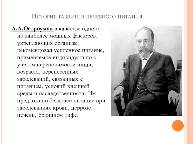 укрепляющих организм, рекомендовал усиленное питание, применяемое индивидуально с учетом переносимости пищи, возраста, перенесенных заболеваний, связанных с питанием, условий внешней среды и наследственности. Им предложено белковое питание при заболеваниях крови, церрозе печени, брюшном тифе.