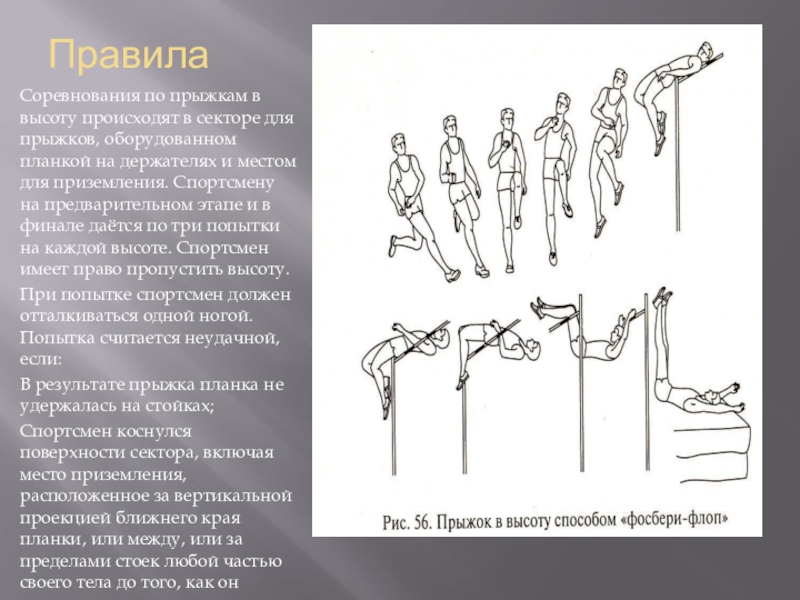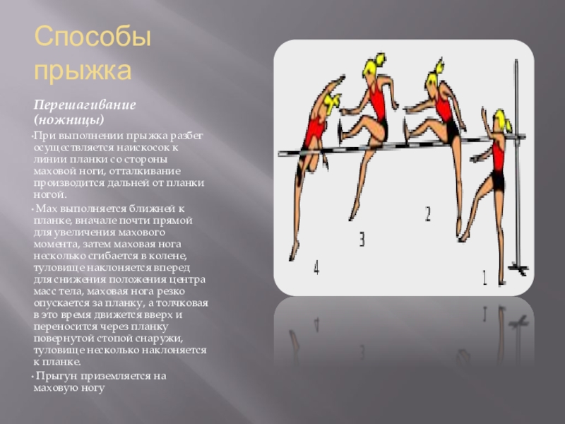разбегаясь наискосок к линии планки со стороны толчковой ноги, отталкивается ближней к планке ногой и приземляется на толчковую ногу.