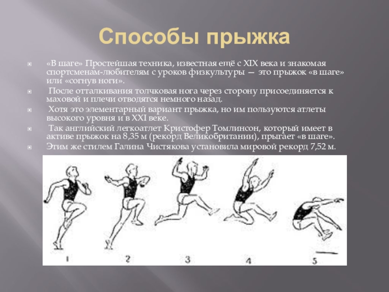 Так английский легкоатлет Кристофер Томлинсон, который имеет в активе прыжок на 8,35 м (рекорд Великобритании), прыгает «в шаге».