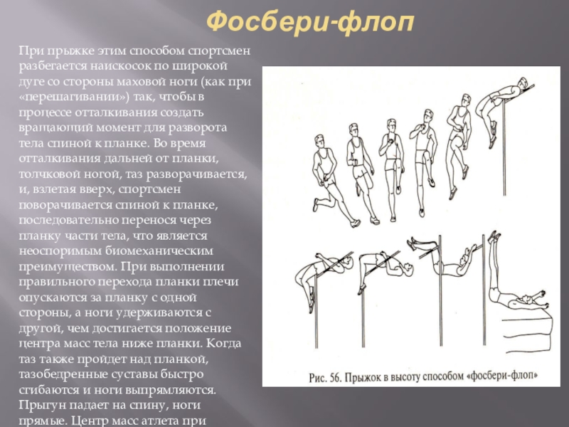 При переходе через планку последовательно маховой, а затем толчковой ногой, при согнутом положении тела и глубоком «нырке» головой вниз за планку центр масс тела проходит ниже планки, что дает преимущество по сравнению с перешагиванием на уровне результатов около 200 см не менее 45 сантиметров.