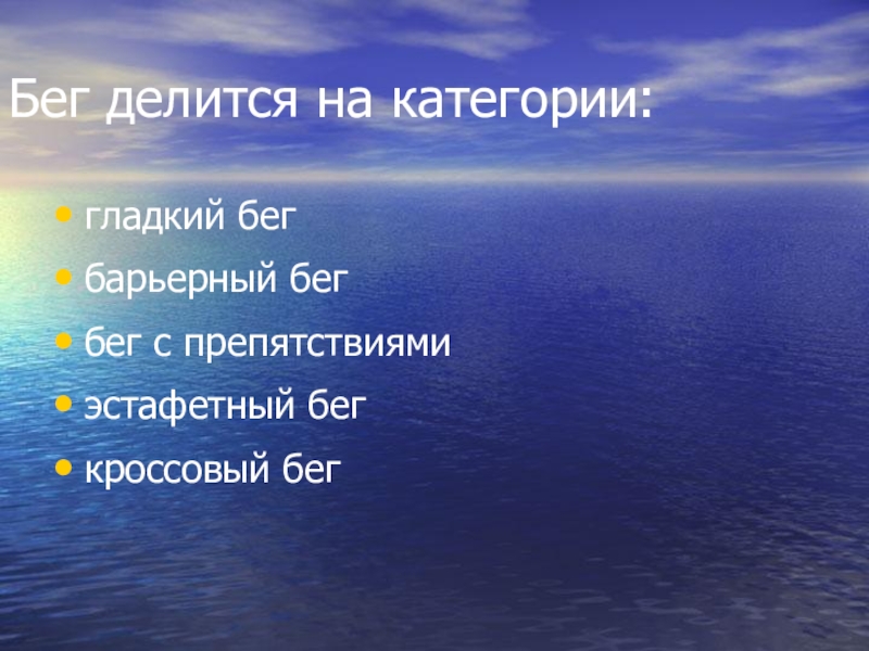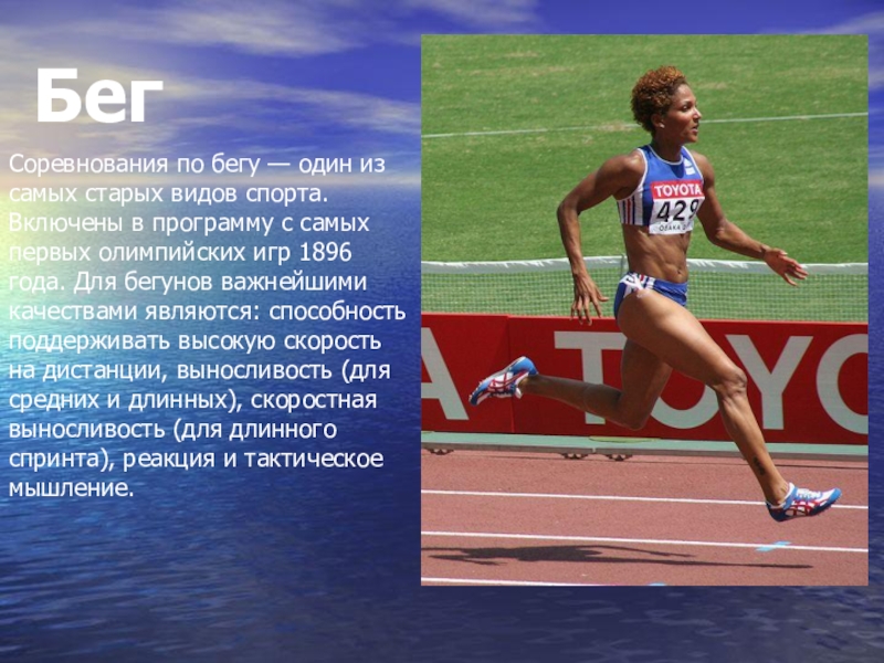 в программу с самых первых олимпийских игр 1896 года. Для бегунов важнейшими качествами являются: способность поддерживать высокую скорость на дистанции, выносливость (для средних и длинных), скоростная выносливость (для длинного спринта), реакция и тактическое мышление.