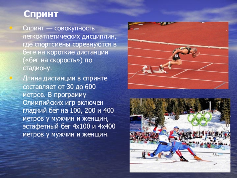 Длина дистанции в спринте составляет от 30 до 600 метров. В программу Олимпийских игр включен гладкий бег на 100, 200 и 400 метров у мужчин и женщин, эстафетный бег 4x100 и 4x400 метров у мужчин и женщин.