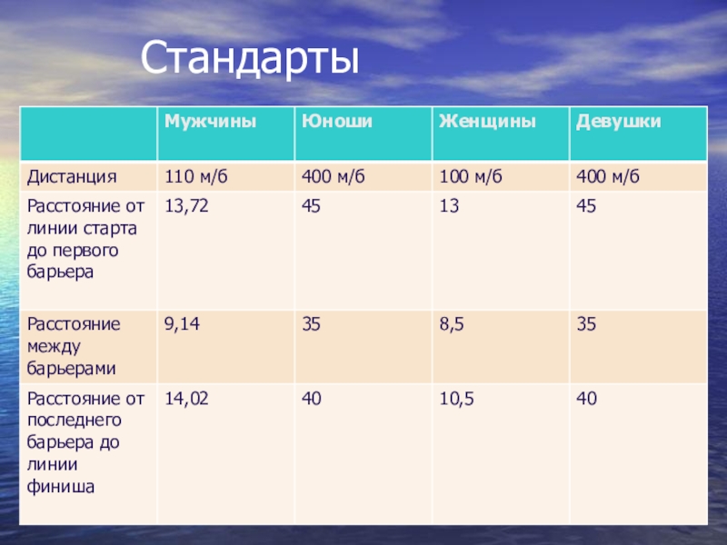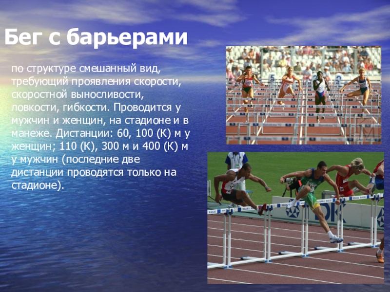 ловкости, гибкости. Проводится у мужчин и женщин, на стадионе и в манеже. Дистанции: 60, 100 (К) м у женщин; 110 (К), 300 м и 400 (К) м у мужчин (последние две дистанции проводятся только на стадионе).