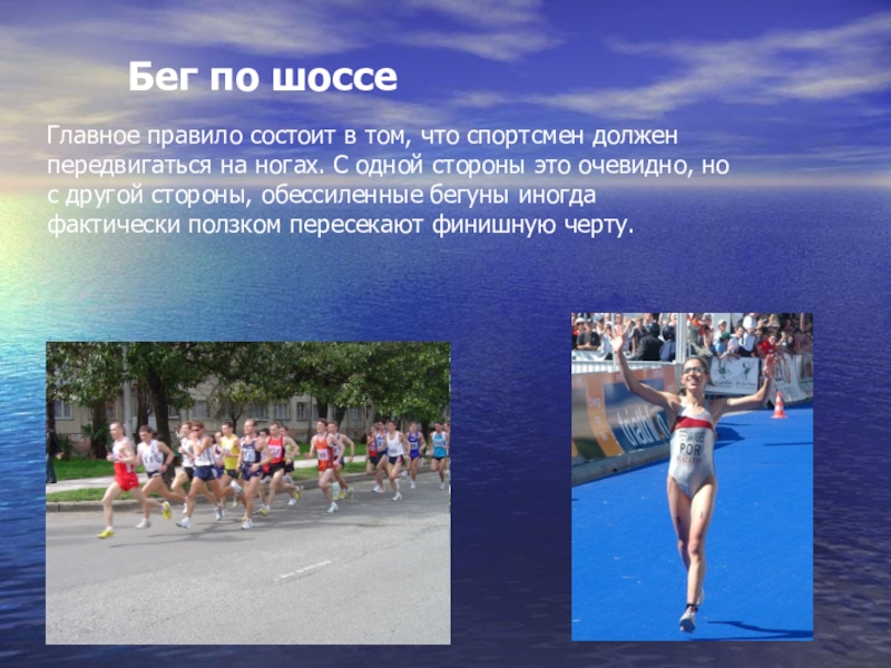 состоит в том, что спортсмен должен передвигаться на ногах. С одной стороны это очевидно, но с другой стороны, обессиленные бегуны иногда фактически ползком пересекают финишную черту.
