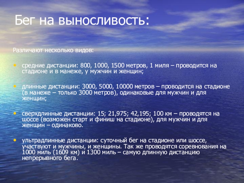 ультрадлинные дистанции: суточный бег на стадионе или шоссе, участвуют и мужчины, и женщины. Так же проводятся соревнования на 1000 миль (1609 км) и 1300 миль – самую длинную дистанцию непрерывного бега.