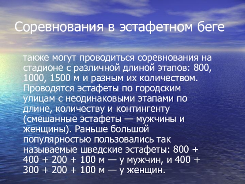 с различной длиной этапов: 800, 1000, 1500 м и разным их количеством. Проводятся эстафеты по городским улицам с неодинаковыми этапами по длине, количеству и контингенту (смешанные эстафеты — мужчины и женщины). Раньше большой популярностью пользовались так называемые шведские эстафеты: 800 + 400 + 200 + 100 м — у мужчин, и 400 + 300 + 200 + 100 м — у женщин.