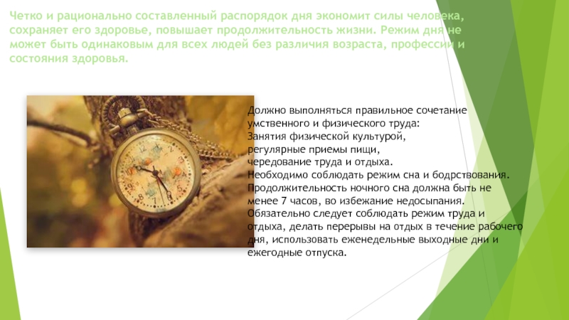 Необходимо соблюдать режим сна и бодрствования. Продолжительность ночного сна должна быть не менее 7 часов, во избежание недосыпания. Обязательно следует соблюдать режим труда и отдыха, делать перерывы на отдых в течение рабочего дня, использовать еженедельные выходные дни и ежегодные отпуска.