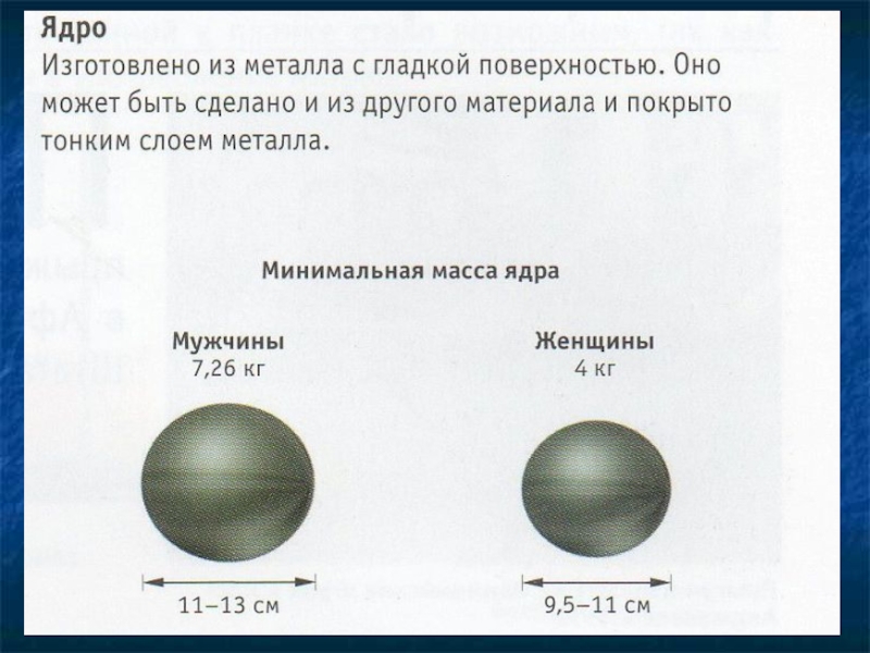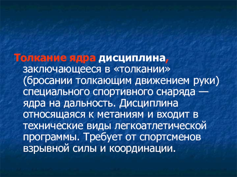 спортивного снаряда — ядра на дальность. Дисциплина относящаяся к метаниям и входит в технические виды легкоатлетической программы. Требует от спортсменов взрывной силы и координации.
