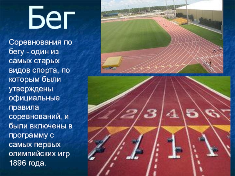 БегСоревнования по бегу - один из самых старых видов спорта, по которым были утверждены официальные правила соревнований,