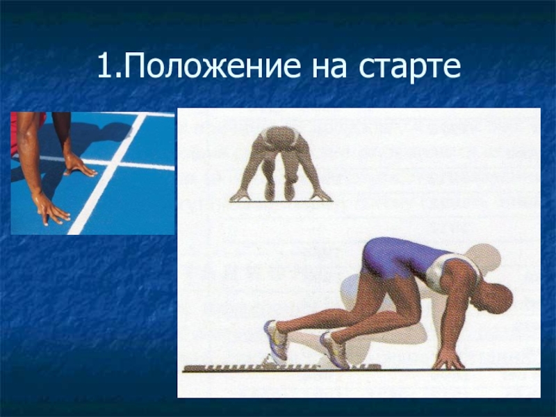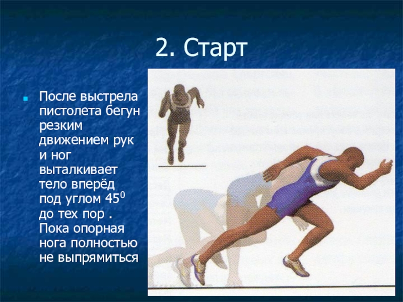 2. СтартПосле выстрела пистолета бегун резким движением рук и ног выталкивает тело вперёд под углом 450 до