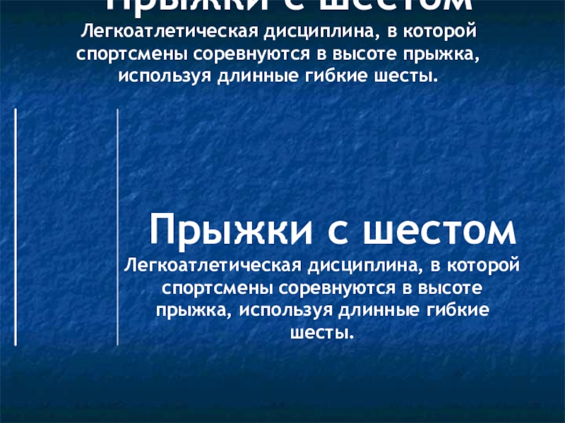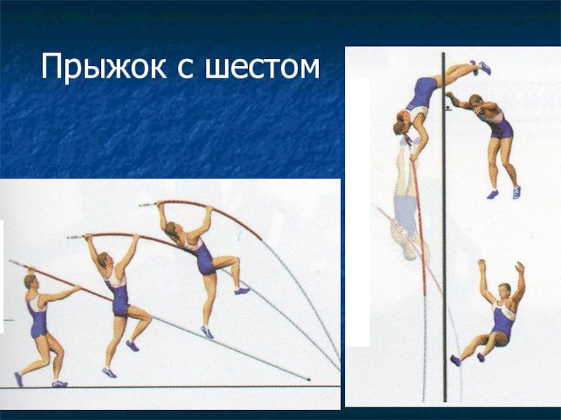 Прыжки с шестомЛегкоатлетическая дисциплина, в которой спортсмены соревнуются в высоте прыжка, используя длинные гибкие шесты.
