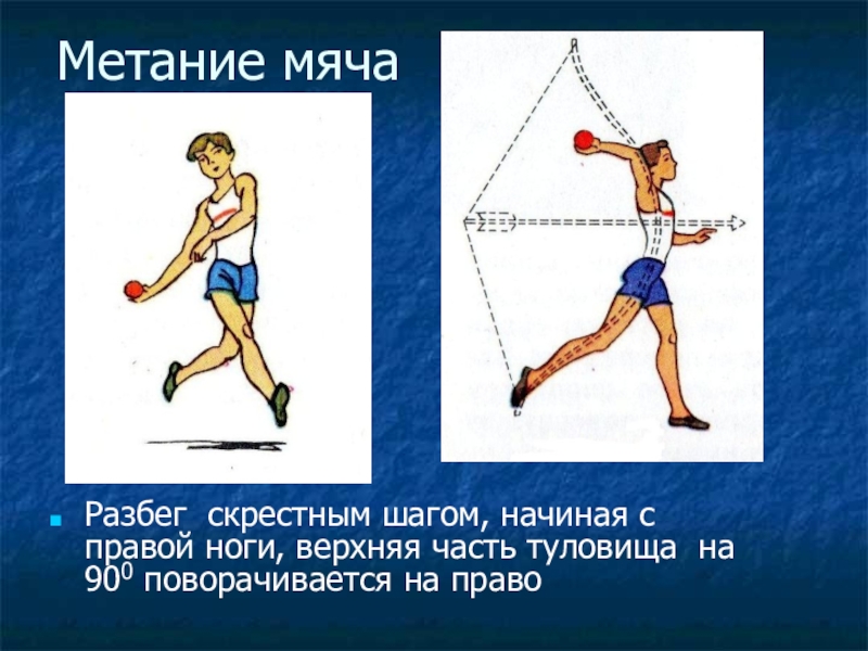Метание мяча Разбег скрестным шагом, начиная с правой ноги, верхняя часть туловища на 900 поворачивается на право