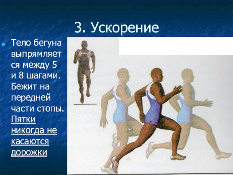 3. УскорениеТело бегуна выпрямляется между 5 и 8 шагами. Бежит на передней части стопы. Пятки никогда не