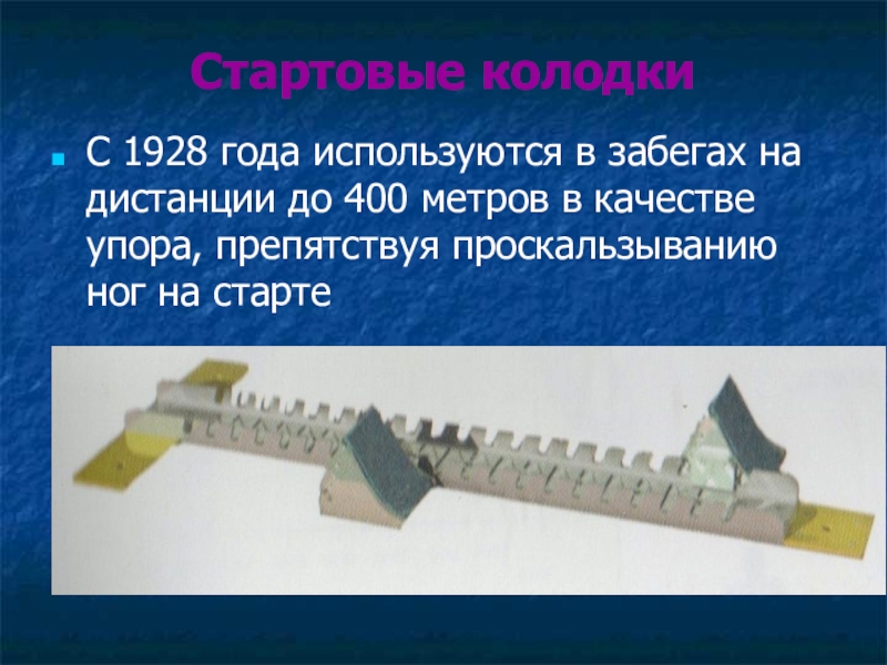 Стартовые колодки С 1928 года используются в забегах на дистанции до 400 метров в качестве упора, препятствуя