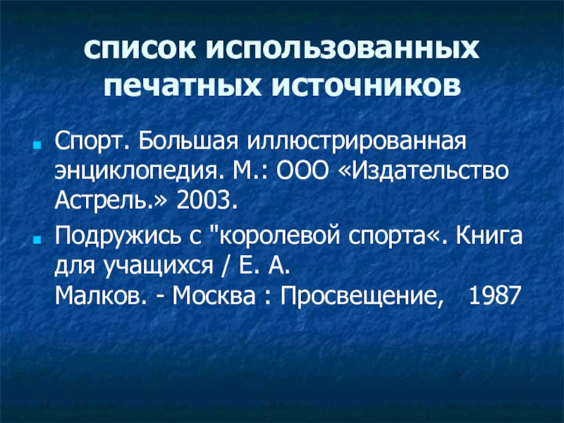 список использованных печатных источников Спорт. Большая иллюстрированная энциклопедия. М.: ООО «Издательство Астрель.» 2003.Подружись с